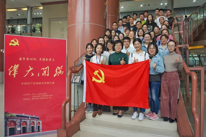 为共同庆祝新中国成立70周年,扎实推进“不忘初心、牢记使命”主题教育,2019年10月12日h图书馆 研究生党总支的全体成员们,在学院党委副书记沈漫老师带领下一同来到了曙光医院住院部2楼,参观《伟大开端——中国共产党创建历史》。