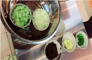 正式开始活动的时间还未到,杂物间大桌子上满满当当地堆满了外套和书包,整栋楼里都是实训室传出的哐哐铛铛切菜的声音。好家伙,大家把袖子都挽了起来,干劲十足,水在锅里咕噜咕噜地冒着泡,菜在水槽里哗哗地冲着水,一人两把刀,手起刀落,刀工了得的小姑娘运筹帷幄,胸有成竹,小伙子们闹哄哄地一通乱剁,也是有模有样,好一派热火朝天的景象。
