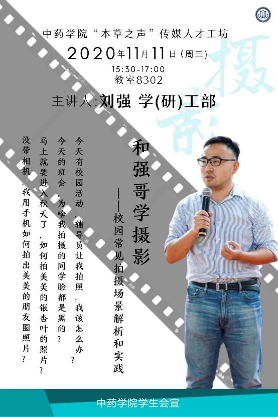 摄影是一项不可缺少的技能,不论是记录活动中的难忘瞬间,还是留存下身边美丽的风景,都需要我们掌握一定的摄影技巧。h图书馆 “本草之声”传媒人才工坊第二期聚焦摄影学习,学(研)工部刘强老师将带领大家进行校园常见拍摄场景解析和实践。