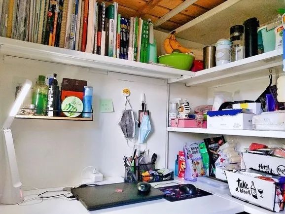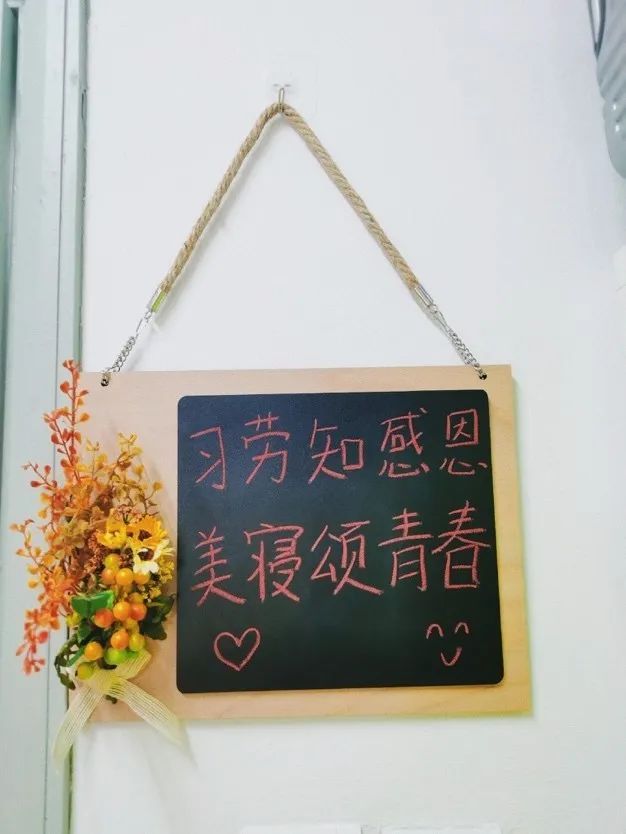 柜子上贴着的中药材,随时方便学习,辨认中药,定期换贴,为将来理论知识真正的运用到实践作准备。学院大礼包的香囊挂在床头防疫助眠提香;摆放旁边的称药方的戥秤可以随时拿起来练习。整个宿舍显得清新,养生而有朝气。