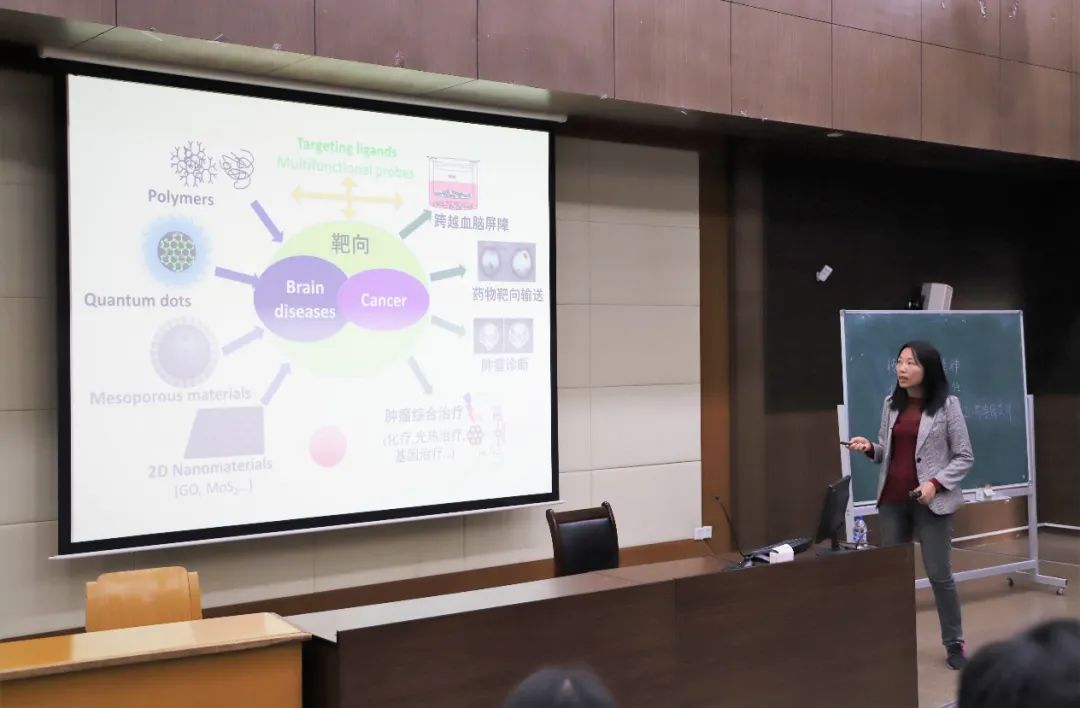 黄容琴教授首先从课题组的研究方向讲起,介绍了课题组在靶向纳米诊疗系统方向的研究情况。以生物可降解型肿瘤药物递送系统为例分享了碳纳米点插入骨架膨胀的降解策略、介孔硅夹层的可降解黑磷纳米片、蛋白冠介导的酸响应降解系统三个方向的成果。分享过程中黄教授引导同学们不断加深思考,了解课题研究背后所需的各项能力与素养,做好从本科生到研究生角色的转变。