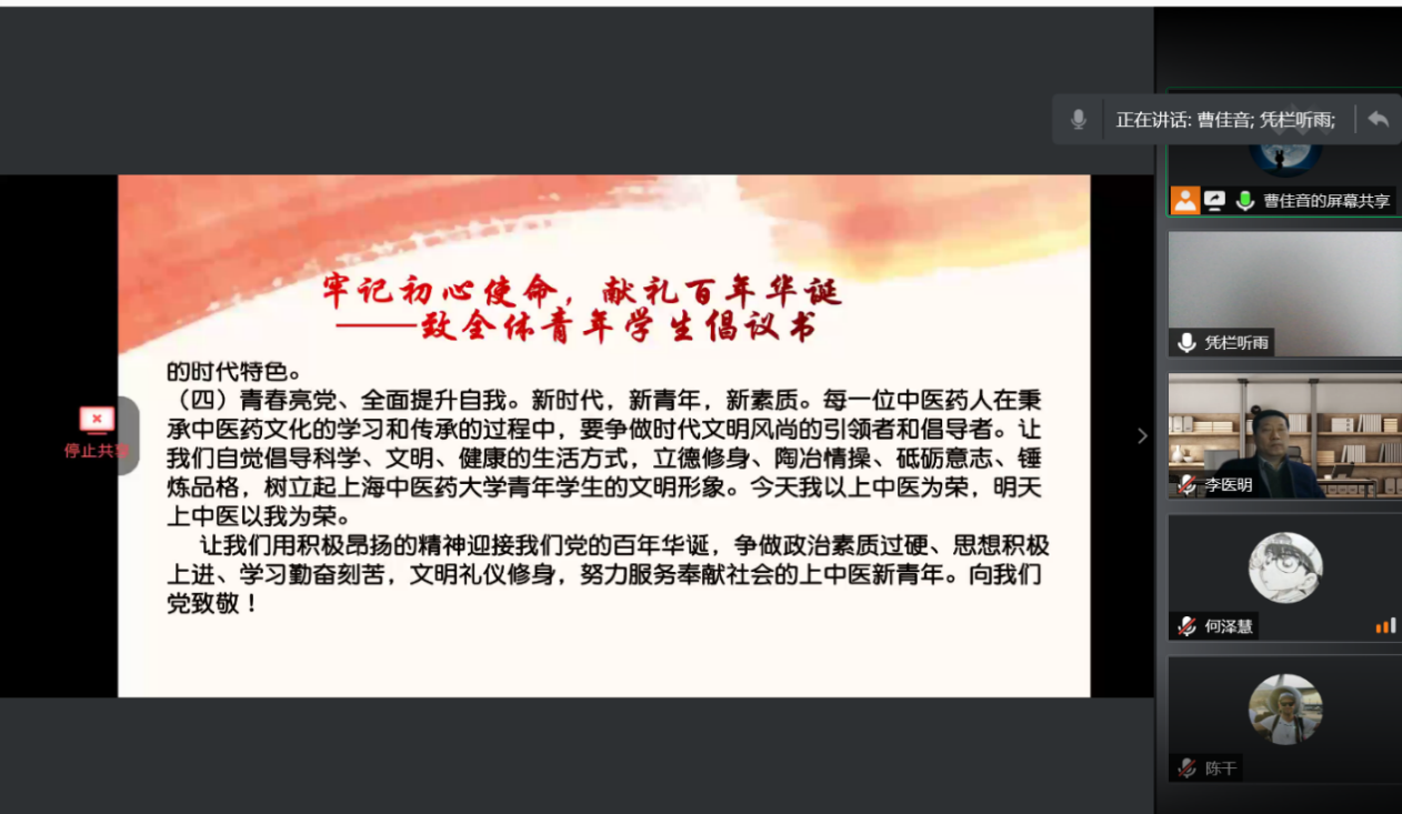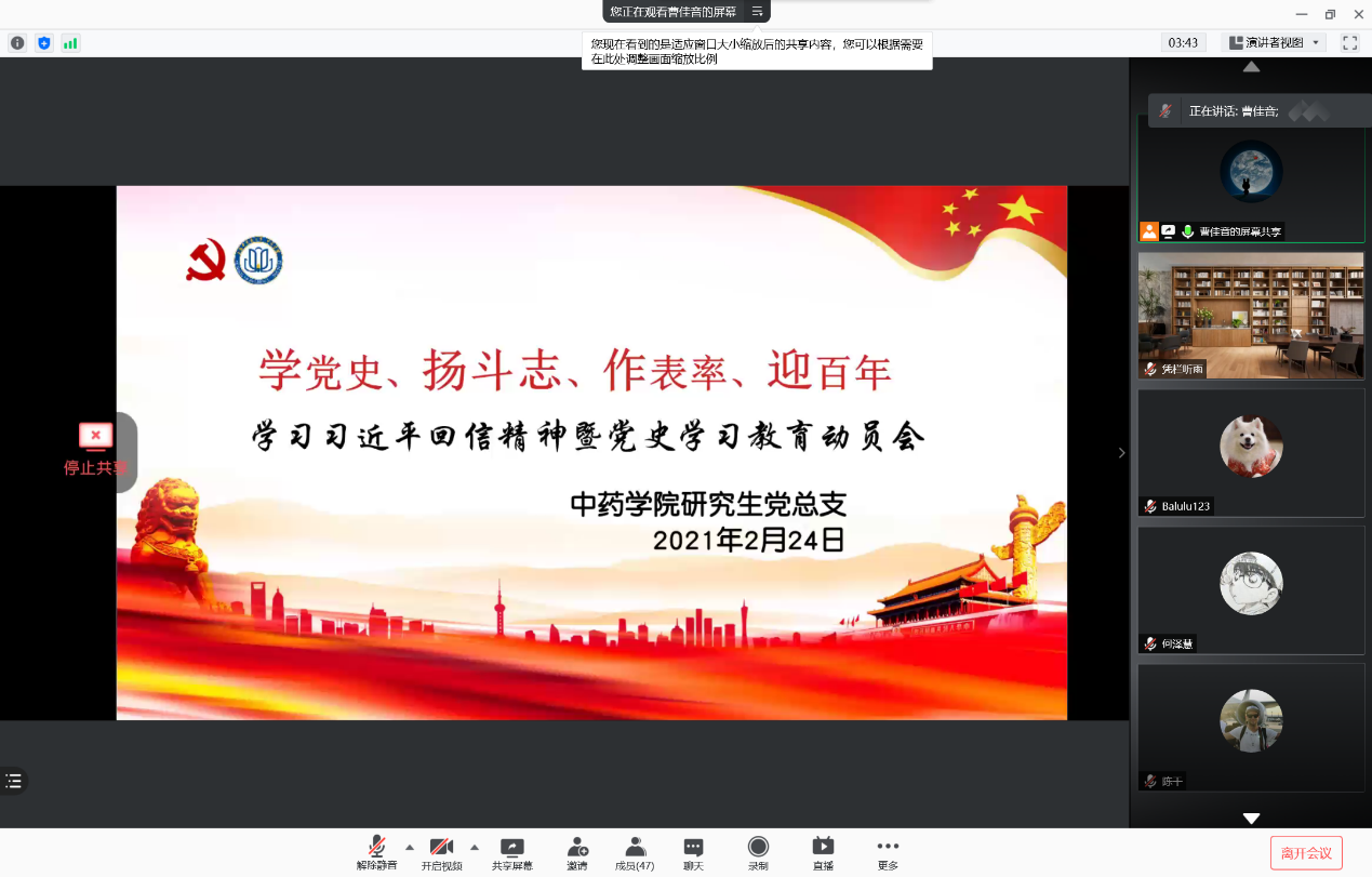 2021年2月20日,党史学习教育动员大会在北京召开,习近平总书记强调,在全党开展党史学习教育,全党同志要做到学史明理、学史增信、学史崇德、学史力行,学党史、悟思想、办实事、开新局。为庆祝中国共产党百年华诞,号召中药学子牢记初心使命,倡议全体青年在新时代接续奋斗,以党史学习教育动员大会为遵循,2月24日,h图书馆 研究生党总支举行党史学习教育动员大会,h图书馆 党委书记李医明老师,党委副书记沈漫老师,研究生党总支书记陈秀兰老师出席,会议由总支组织委员曹佳音主持,研究生党总支全体党员参会。