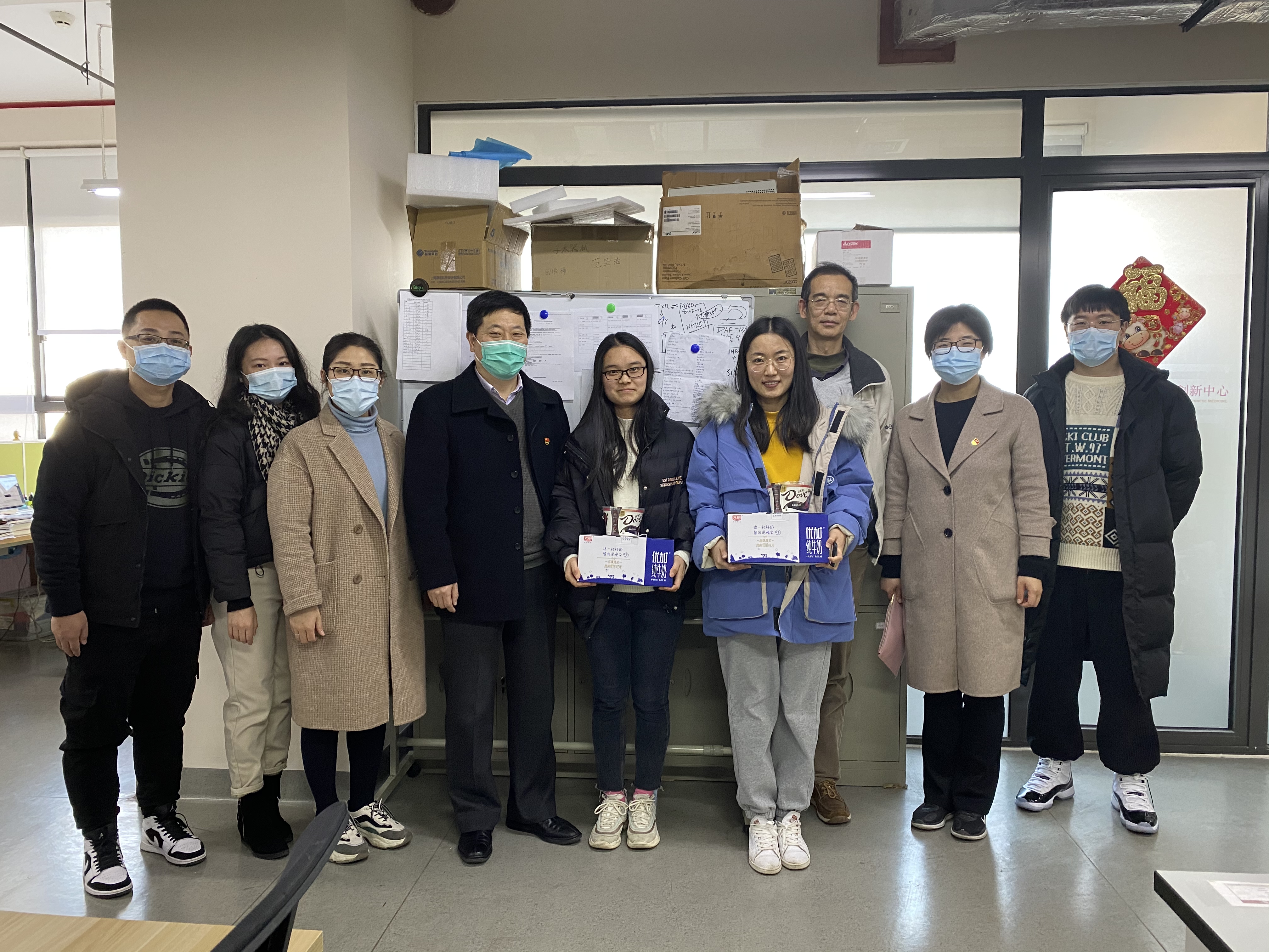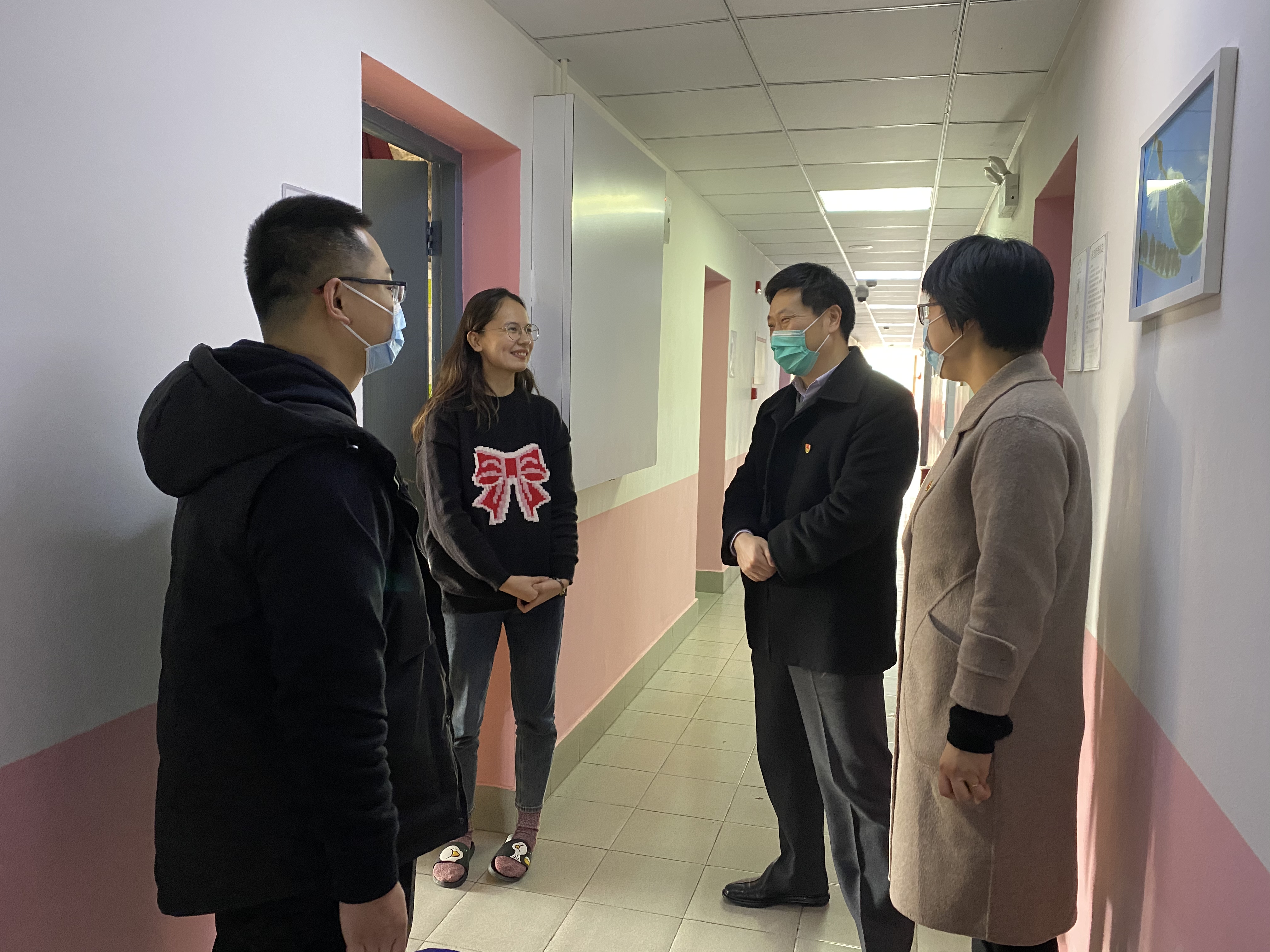 为关心和深入了解寒假留校学生的学习和生活情况,使学生们度过一个健康、快乐的春节,24日下午,在h图书馆 党委书记李医明、副书记沈漫的带领下,辅导员王倩倩、王盼、胡志强、范丽晨等4位老师来到实验室、宿舍园区看望并慰问了留校的学生。