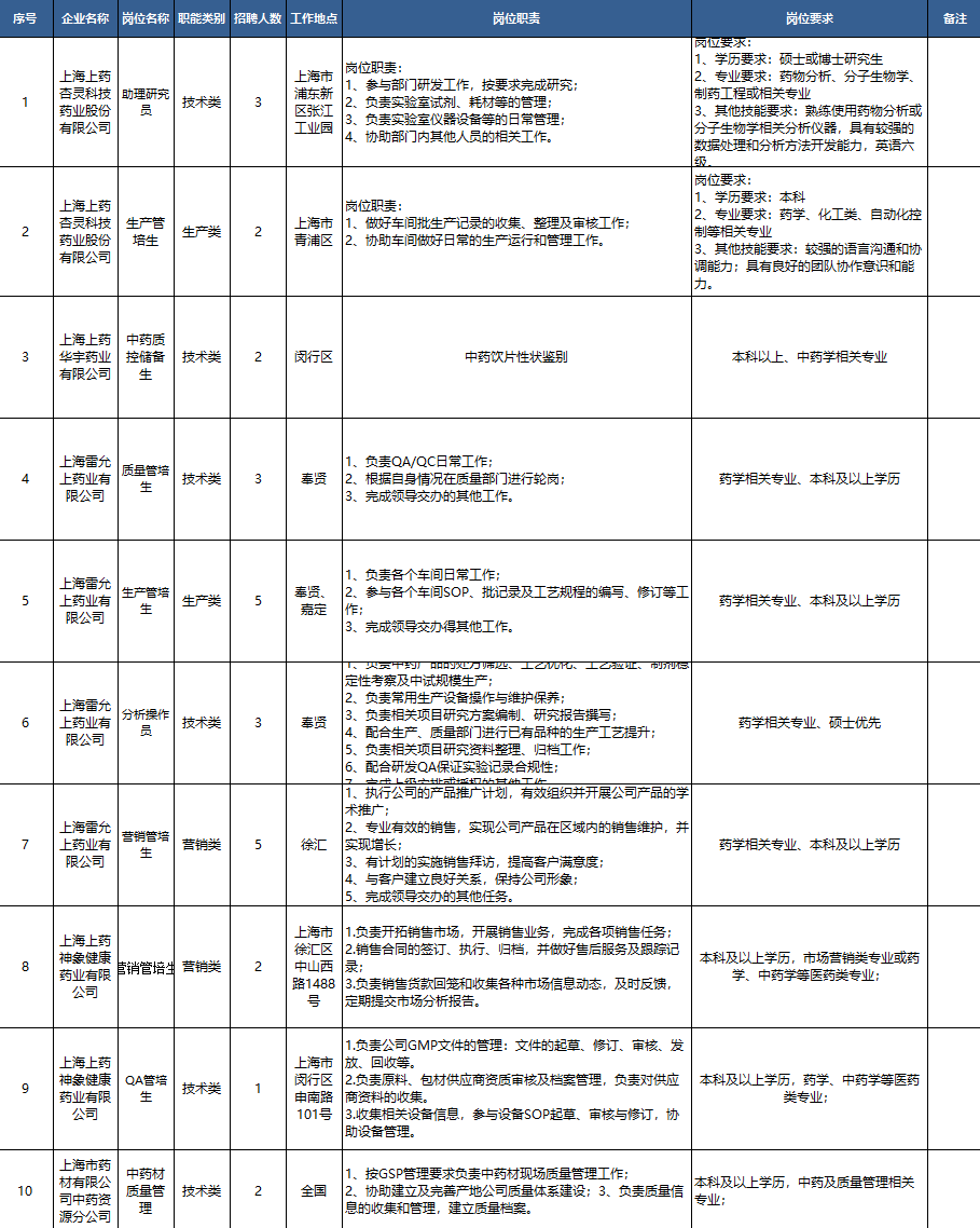 1. 药学、中药学、生物制药、设备管理等专业;2. 沟通能力强,性格开朗。