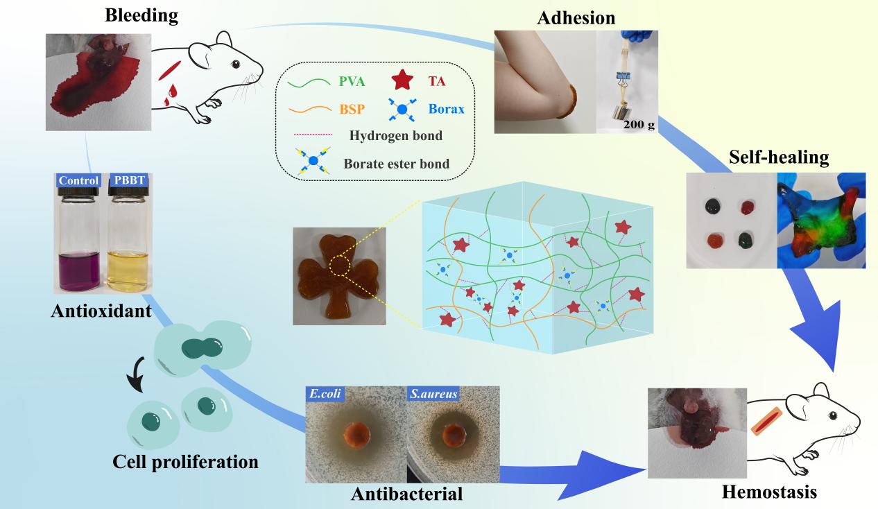 白及多糖(Bletilla striata polysaccharide,BSP)是中国传统止血敛疮药白及的主要活性成分,在生物医学领域具有广阔的应用前景。沈岚研究团队以天然多糖BSP为主要网络骨架,动态的聚乙烯醇-硼砂化学网络为另一基质体系,以单宁酸作为理化交联中心整合网络,通过简单的一锅法合成了新型双动态交联水凝胶。BSP在通过多糖结构特性担任网络骨架的同时,凭借自身良好的药理活性和生物相容性赋予了水凝胶材料体内外止血性能和安全性。新材料中动态共价硼酸酯键和可逆非共价氢键的协同作用,以及四种组分之间的合理组合使得新型水凝胶展现出增强的机械性能、组织粘附性和快速自愈性等材料特性,以及包括抑菌、抗氧化和快速止血在内的良好药效性能。作为一种出色的止血粘合剂,该新型水凝胶材料有望为解决未来急性出血、伤口愈合和其他生物医学应用问题提供一种新的解决方案。