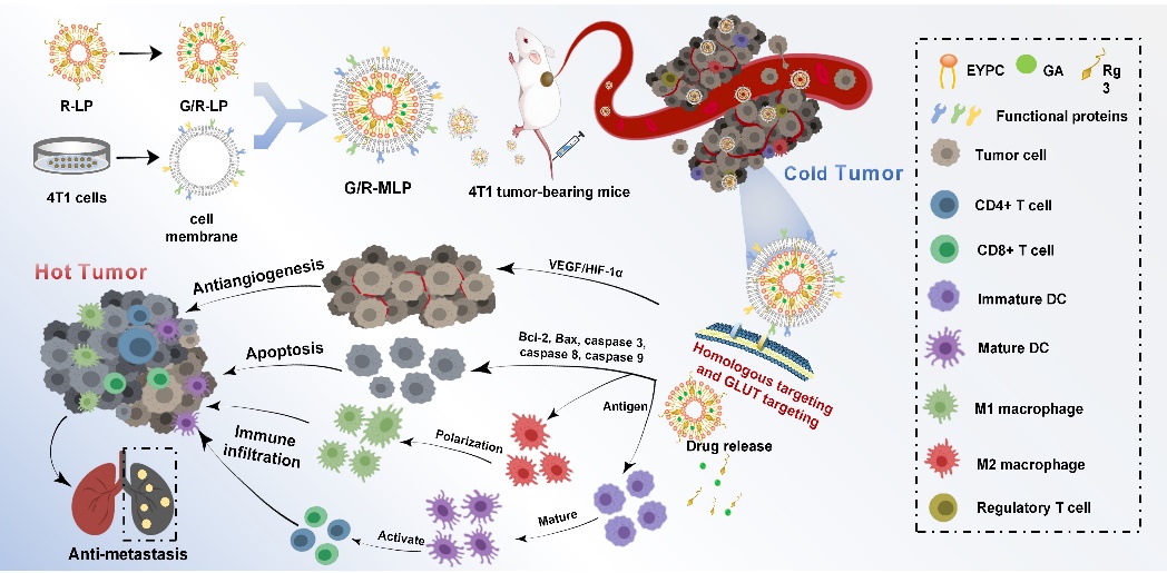 在本研究中,为提高Rg3和GA协同抗三阴性乳腺癌作用,利用“药辅合一”的中药制剂策略和仿生技术,通过肿瘤细胞膜修饰以及人参皂苷Rg3替代胆固醇,开发了一种多功能仿生脂质体包载藤黄酸GA(G/R-MLP),旨在通过同源靶向和葡萄糖转运蛋白靶向将药物特异性递送至肿瘤部位和转移病灶。准确到达并渗透到肿瘤病灶后,G/R-MLP中的Rg3和GA组合通过杀死肿瘤细胞、抑制肿瘤细胞迁移和侵袭,显著抑制肿瘤生长和肺转移。此外,G/R-MLP通过抑制血管生成和提高抗肿瘤免疫力,有效重塑肿瘤微环境。G/R-MLP总体通过协同化疗、抗血管生成和免疫疗法有效治疗三阴性乳腺癌。本研究将中医药理论与现代仿生纳米递药系统相结合,为GA的临床转化应用提供参考,也为三阴性乳腺癌治疗提供策略。