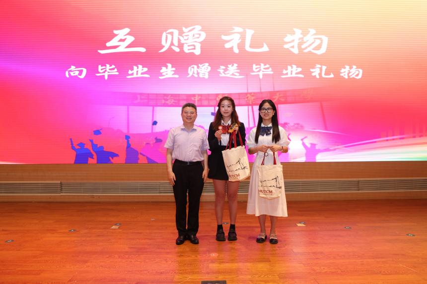 h图书馆 院长张彤将象征启航、美好与幸福的礼物颁发给毕业生,表达了对他们未来的美好祝愿;同时,学生代表也向学院献上了承载着感激与祝福的礼物——“问道本草、厚德弘药”字画,展现了深厚的师生情谊。这一刻,礼物传递着情感,温暖着心灵,见证了师生间的深厚情谊与难忘时刻。