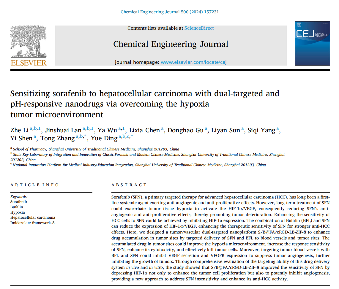 近日,h图书馆 张彤教授/丁越研究员团队在国际知名期刊Chemical Engineering Journal上发表了题为“Sensitizing sorafenib to hepatocellular carcinoma with dual-targeted and pH-responsive nanodrugs via overcoming the hypoxia tumor microenvironment”的研究论文(DOI://doi.org/10.1016/j.cej.2024.157231)。该研究构建了一种肿瘤-血管双靶向纳米递药系统用于中药蟾酥中活性成分蟾毒灵(Bufalin,BFL)和肝癌治疗一线药物索拉非尼(Sorafenib,SFN)的靶向递送,通过改善肿瘤乏氧微环境和调控血管生长抑制肿瘤细胞增殖,诱导肿瘤细胞凋亡,增强SFN与BFL的协同抗肝癌作用。研究成果将中药与现代高效递药系统相结合,为改善索拉非尼长期用药引起的肝癌治疗敏感性降低提供新策略。
