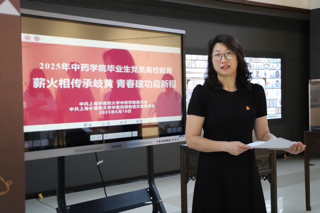 中医药博物馆党支部副书记郭峰围绕“传承、医德与探索”三大核心展开,讲述了李时珍、孙思邈、张仲景三位中医药大家的生平与贡献,展现了他们对中医药事业的执着追求和高尚医德。郭书记希望毕业生党员们能够铭记这份深厚的文化积淀和精神财富,坚守中医药“传承与创新并重”的时代使命,立足于中医药独特优势,运用辩证思维审视和推动中医药的发展,在各自岗位上为中医药现代化建设贡献力量,助推中医药在新时代焕发新的活力与光彩。