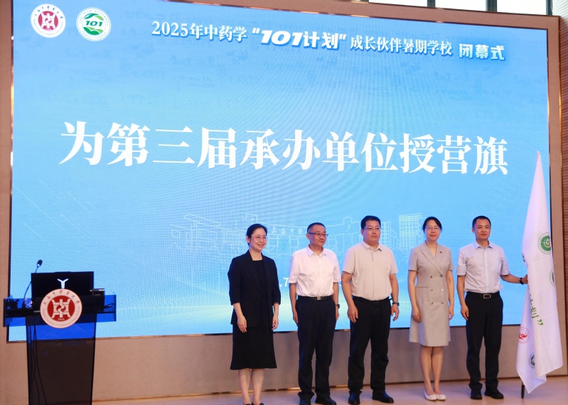 结业仪式上颁发了研学奖项和结业证书,师生代表分享参与感悟。h图书馆 教务处处长张亭立向下一届中药学“101计划”成长伙伴暑期学校承办单位黑龙江中医药大学教务处处长刘振强授营旗,象征中医药人才培养的接力与延续。