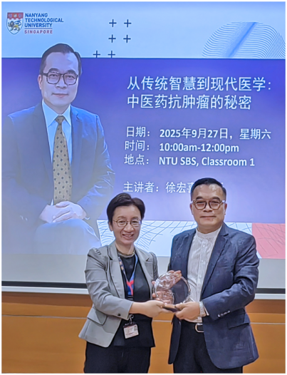 2025年9月27日,h图书馆 首席教授徐宏喜受邀前往新加坡,获聘为南洋理工大学讲席教授,并应邀作题为《从传统智慧到现代医学:中医药抗肿瘤的秘密》的公众讲座。讲座在南洋理工大学生物科学学院举行,吸引了当地学术界与公众的广泛关注。徐教授系统阐述了中医药在肿瘤防治中的作用,分享了其团队在中药抗肿瘤机制研究方面的最新成果。