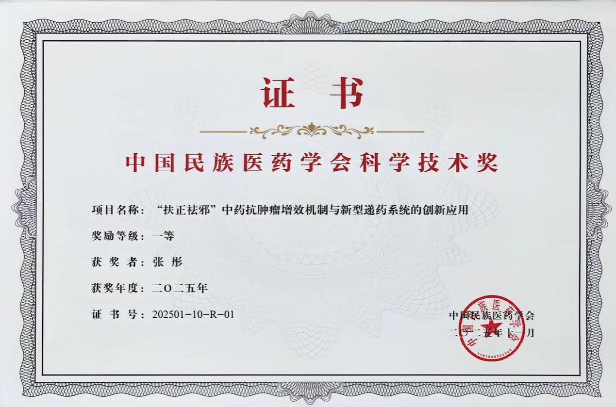2025年12月7日,2025年度中国民族医药学会科学技术奖励大会在江苏连云港召开。h图书馆 张彤教授领衔完成的《“扶正祛邪”中药抗肿瘤增效机制与新型递药系统的创新应用》项目荣获中国民族医药学会科学技术奖一等奖。