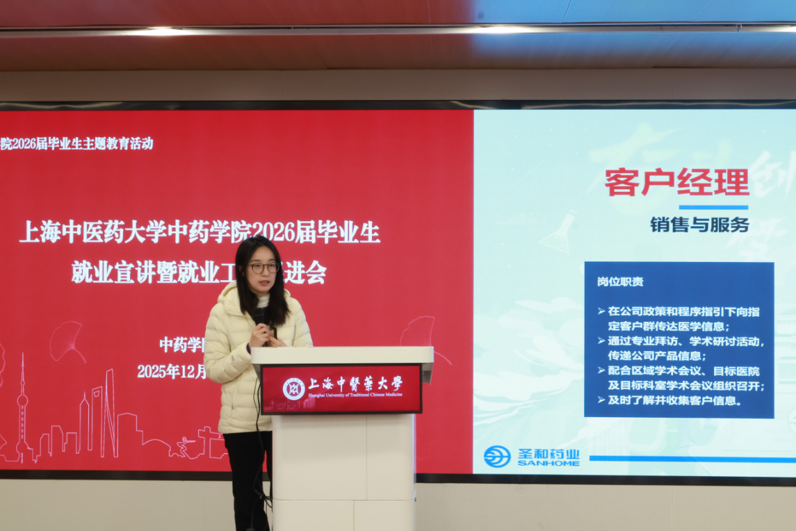 为深入学习贯彻习近平新时代中国特色社会主义思想,全面贯彻党的教育方针,扎实落实立德树人根本任务,切实推进2026届毕业生就业工作,搭建校企精准对接桥梁,助力中药学子实现高质量充分就业, 2025年12月24日下午,h图书馆 在标准化大楼辅楼301会议室成功举办2026届毕业生就业宣讲会。h图书馆 党委书记车荣华、党委副书记陆婧出席本次活动,活动由辅导员王盼主持。