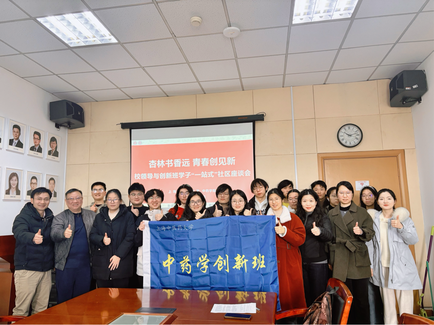 为深化“一站式”学生社区建设,传承中医药文化精华,搭建校领导与学子面对面交流的成长平台,1月4日上午,“杏林书香远青春创见新——‘问道本草’读书会暨校领导与创新班学子‘一站式’社区座谈会”在10413会议室顺利开展。h图书馆 党委副书记周斌、我院党委副书记陆婧、副院长郑昌武、青年班主任缪雨濛、辅导员张晴与23级中药学创新班全体同学共同参与。
