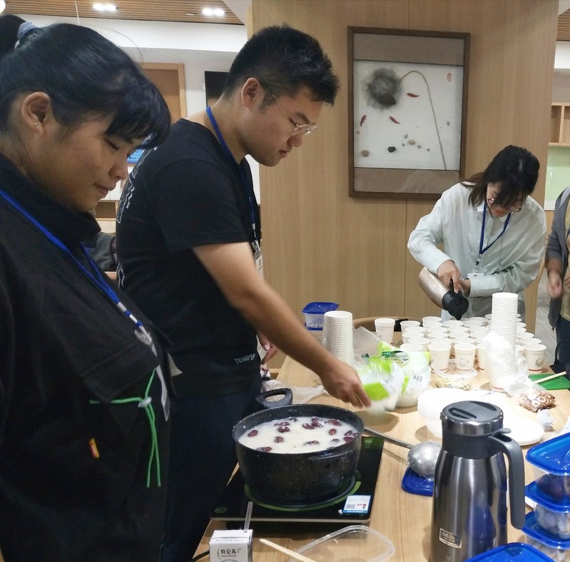 第二党支部与院科学商店的同学们早早到达了新苑三四居委会,在居委会工作人员的带领下前往附近的敬老院,开始布置现场、准备活动材料:泡茶、熬粥、准备PPT,井然有序。不久后参加活动的居民便陆续进入活动室,将我们的准备台牢牢围住,显然对我们精心准备的“滋补佳品”十分感兴趣。