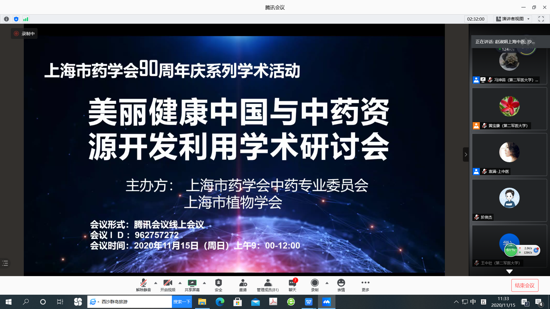 2020年11月15日由上海市药学会中药专业委员会与上海市植物学会通过线上会议形式共同举办了“美丽健康中国与中药资源开发利用学术研讨会”。参加会议的代表来自上海市药学会中药专业委员会以及生药专业委员会、老年专业委员会委员和会员,上海市植物学会的理事和会员,以及从事中药及植物资源相关研究领域的同行和研究生共90余名。中药专业委员会主任委员徐宏喜教授作开幕式讲话。会议邀请了6位专家学者对中药资源可持续利用与健康中国、美丽中国,青山绿水与生态保护等主题内容进行了报告交流。h图书馆 院长徐宏喜教授“健康美丽话人参”的报告,风趣而生动地介绍了人参的资源、品质、临床应用以及课题组的研究成果,让大家对人参的认识更进一步。