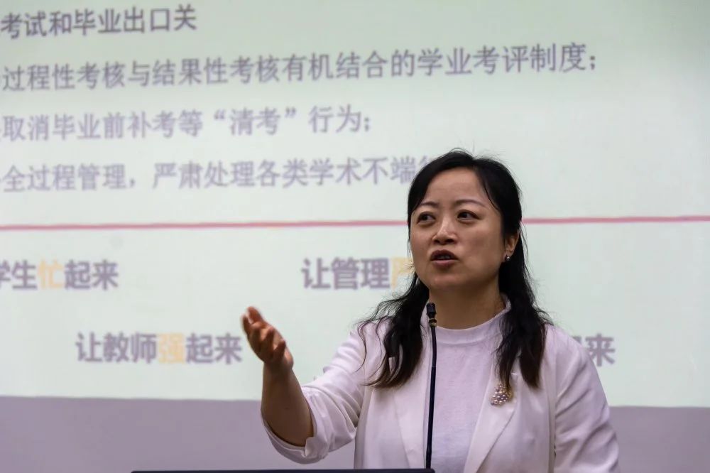 而后,沈岚从学生规模、师资规模和教研室架构等三个方面介绍了h图书馆 的整体架构,h图书馆 拥有8个教研室,专业教师共67名,其中教授18名,副教授27名,具有浑厚的师资队伍。在同类院校中,具有明显的师资优势和平台优势,希望同学们坚定信心,取好、用好学院的师资资源。