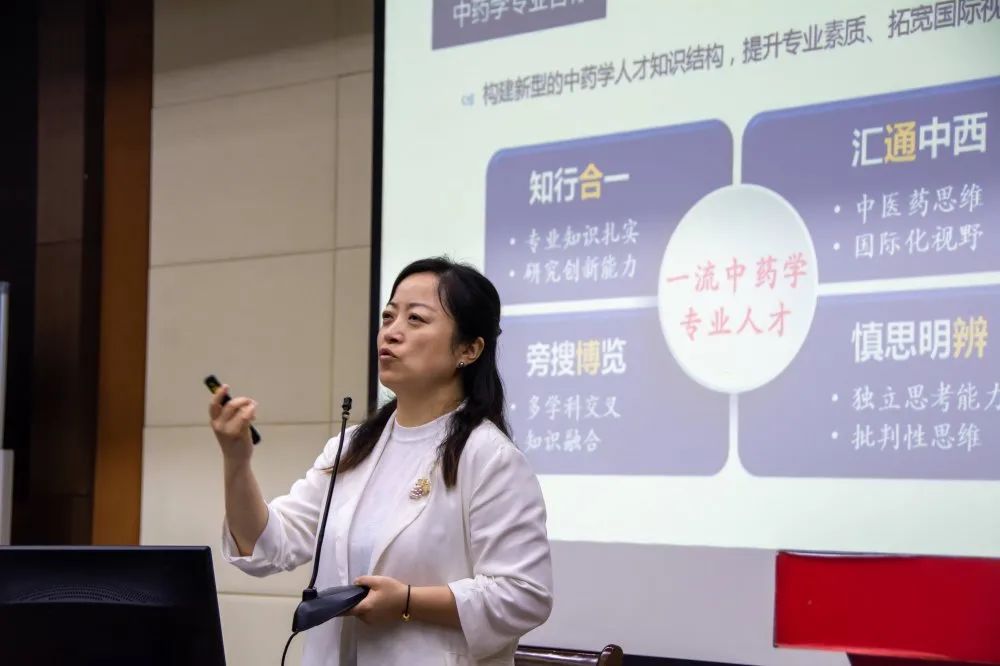 沈岚首先从中药学、药学两个专业的培养角度讲述了专业培养方案及要求。她倡导全体新生同学树立良好学风,遵守教学规定,守住考核底线;激励中药学同学要巩固专业知识,拓宽国际视野;鼓励药学同学顺应中医药全球化发展态势,成为“内外兼修”的药学人才。