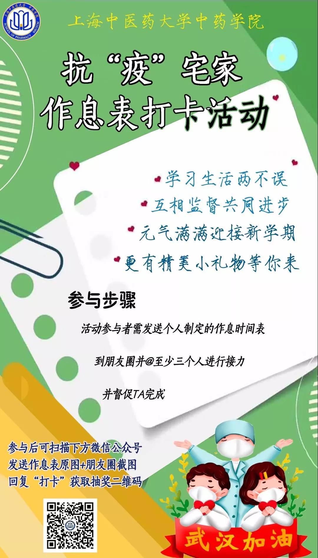2020年寒假疫情爆发,第二学期开学时间被迫延迟。3月2日学校将正式开始线上教育,为鼓励所有学院学生提前调整好作息,以便有序安排好居家学习生活,更快地进入学习状态,特开展抗“疫”宅家·作息表打卡活动。现将相关事项通知如下:
