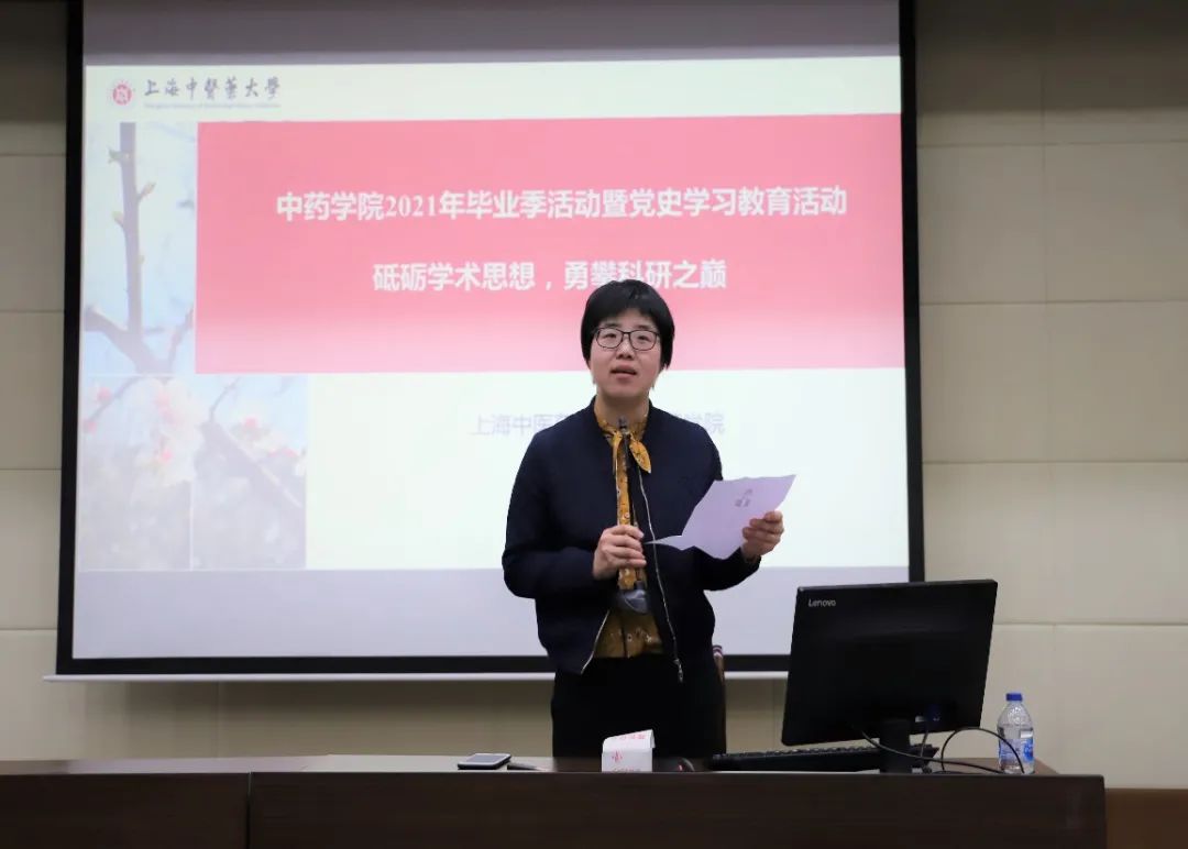 5月6日,h图书馆 在教学楼6501教室举行h图书馆 2021年毕业季主题教育活动暨党史学习教育第三场讲座《砥砺学术思想,勇攀科研之巅》,会议由h图书馆 党委副书记沈漫主持。会前沈书记介绍了本次的主讲人黄容琴教授,黄容琴教授系复旦大学药学院教授,博士生导师,国家优秀青年科学基金获得者。沈书记就黄教授的科研履历、课题研究、学术兼职等向同学们做了详细的介绍,希望广大毕业生在今后的的科研求学中积极进取、锐意创新,不断创新中药研究,用更高质量的科研成果推动中医药的现代化研究。