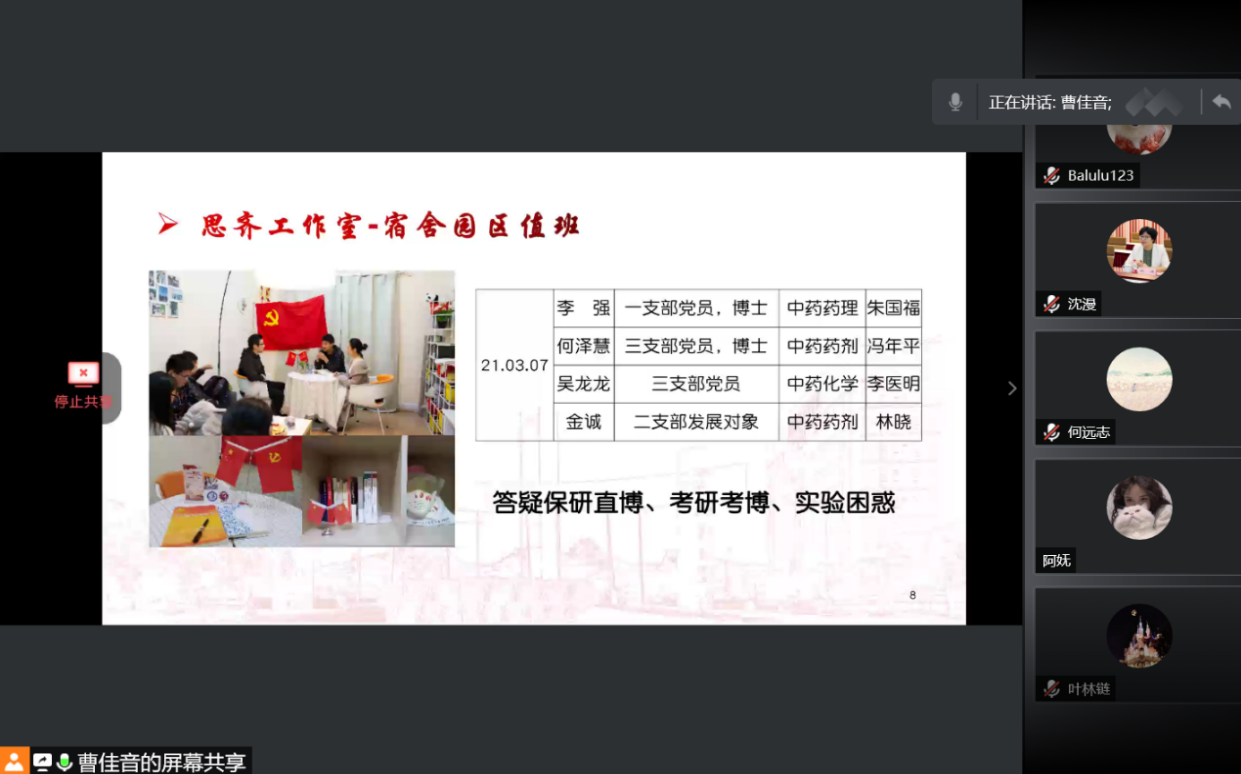 作表率以实际行动喜迎百岁华诞,党的百年华诞,举国同庆,研究生党总支为更好地迎接党的百岁生日,总支委员进行策划,并征求了全体党员的意见和建议,以“迎百年、学党史、扬斗志、作表率”为主题的系列活动。具体包括:二月份开展党史学习教育启动大会,增强各党员主动学习党史意识;三月份学雷锋义务活动暨园区值班;四月份清明缅怀纪念革命先烈;五月份举办五四青年活动,扬青年蓬勃朝气;六月份毕业季及服务校园,优异成绩向党献礼;七月份隆重迎接建党百年。活动形式多样,读书会、朋辈分享会、课题组互动交流会、师生党支部共建学习交流会、研究生与本科生党支部共建分享交流会,进社区、进园区、进藏区等研究生党总支经典品牌服务项目……研究生党总支学党史系列喜迎百年项目结合研究生专业和学习实际,内容丰富,意义深远,有利于提高各党员的思想内涵。