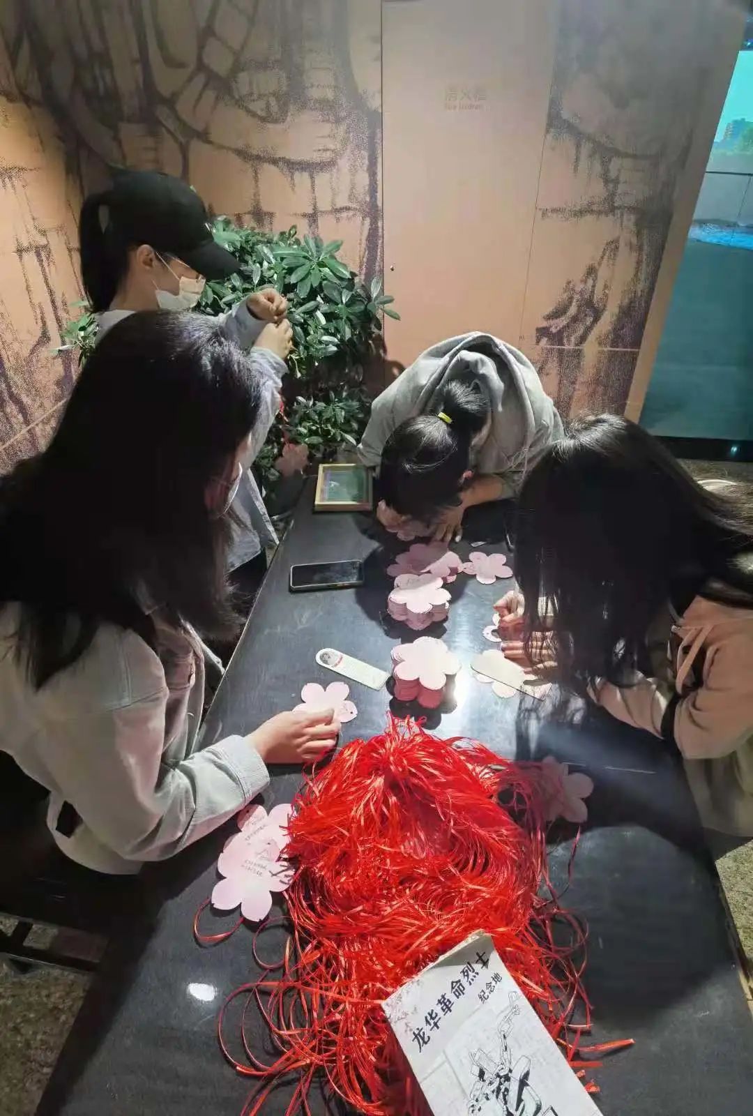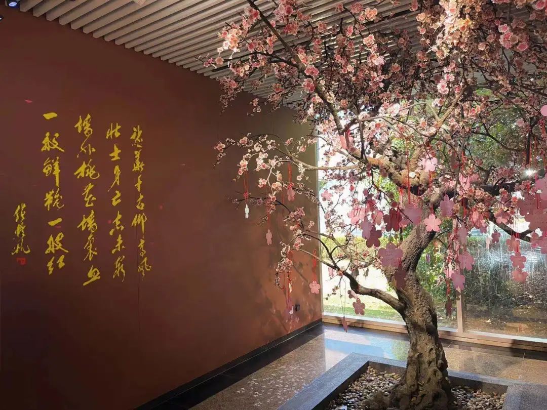 桃花树下,同学们正认真地将自己最真挚的寄语书写在桃花便签上,表达对革命先辈的钦佩和无尽的追思,同时也是对于革命精神的敬仰;他们纷纷将自己的寄语系在树上,汇成一棵动人的桃花树。
