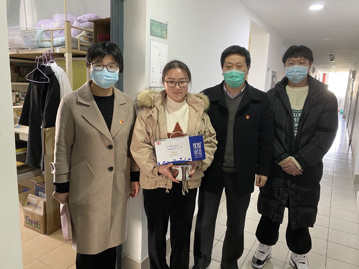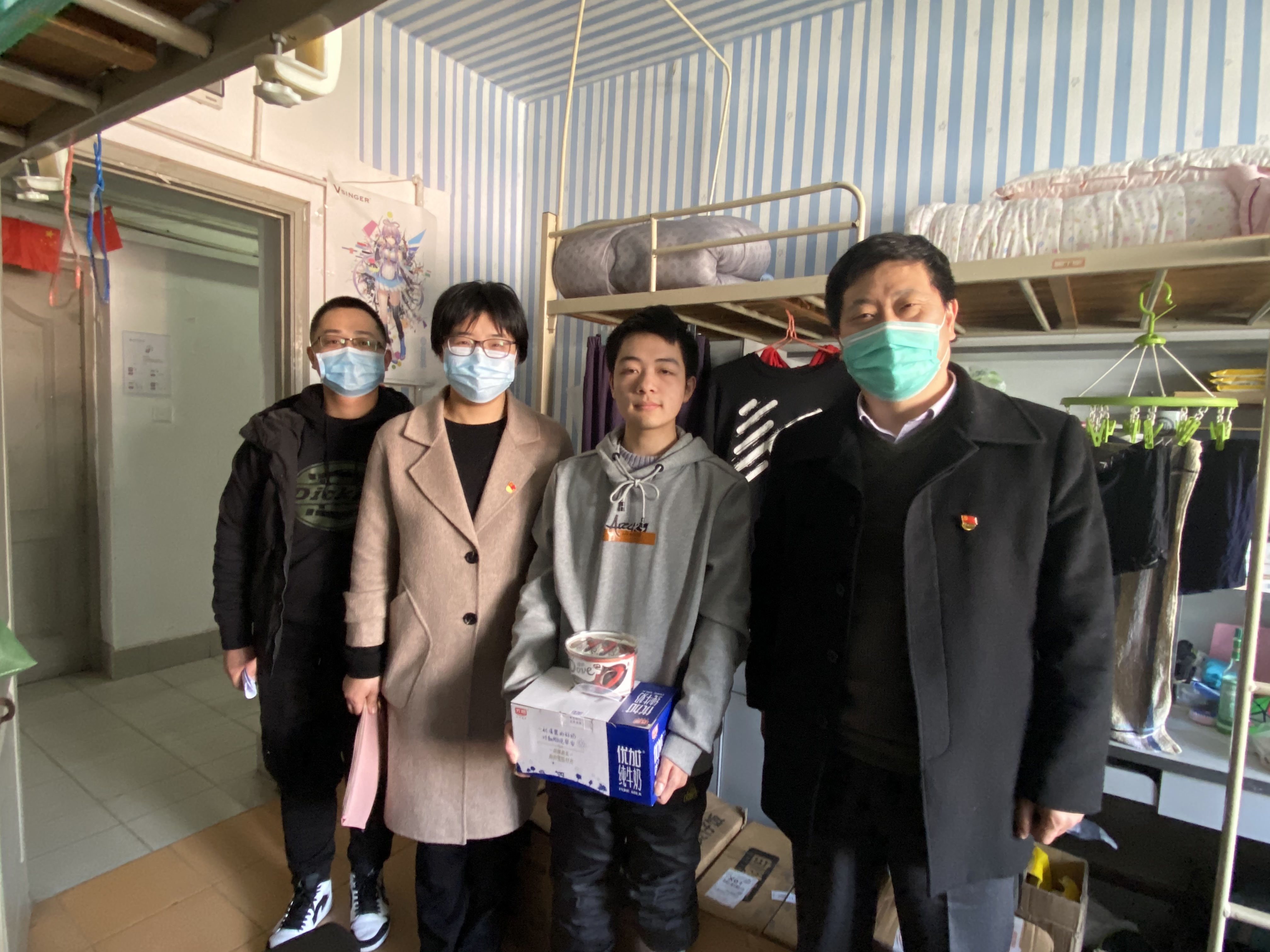 为关心和深入了解寒假留校学生的学习和生活情况,使学生们度过一个健康、快乐的春节,24日下午,在h图书馆 党委书记李医明、副书记沈漫的带领下,辅导员王倩倩、王盼、胡志强、范丽晨等4位老师来到实验室、宿舍园区看望并慰问了留校的学生。