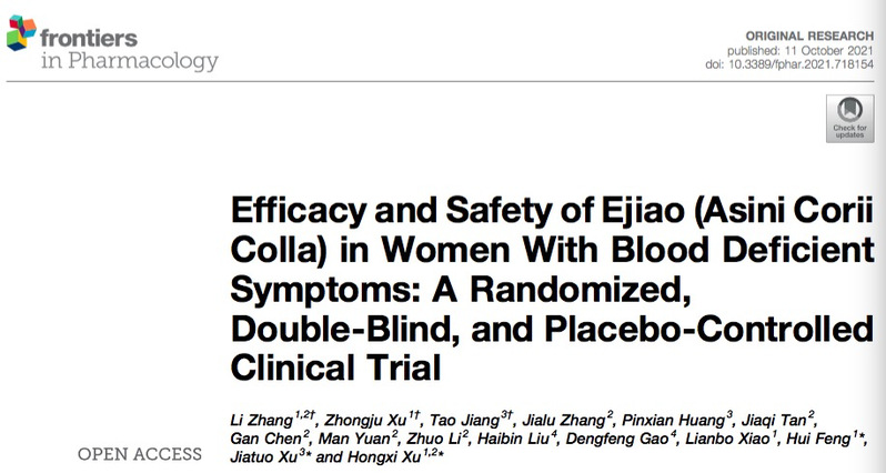 阿胶由动物驴的干燥皮或鲜皮经煎煮、浓缩而成。其具有补血、滋阴、润燥、止血安胎的功效,自古被列为上品中药,有“补血圣药”之称。近日,h图书馆 首席教授徐宏喜团队与h图书馆 附属光华医院肖涟波团队合作,首次利用随机对照双盲临床试验对阿胶治疗血虚患者的疗效和安全性进行了系统的研究。该研究结果表明阿胶对血虚症有很好的治疗效果,且无明显不良反应。