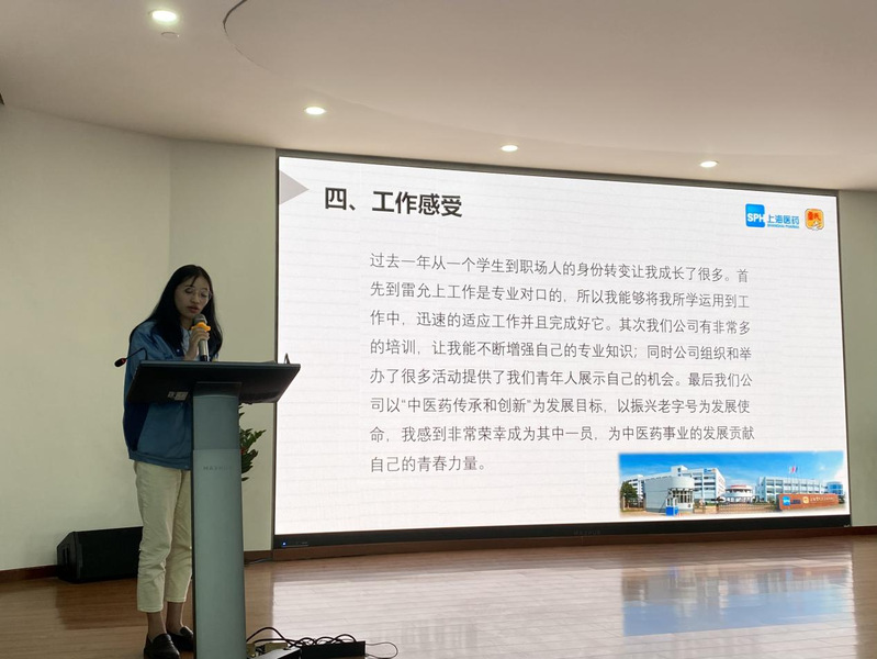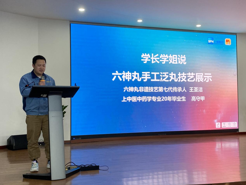 随后,上海雷允上药业有限公司副总经理李琦与h图书馆 党委书记沈岚共同为上海雷允上药业有限公司岐黄育人实践基地揭牌,推动了校企合作迈上新台阶。16级中药学毕业生高守甲、17级中药学毕业生王雨婷、18级中药学毕业生黄邦路进行“学长学姐说”分享,分享了入职上海雷允上药业有限公司后的个人成长与发展,对学校及公司的培养表示感谢,后期也将秉持初心继续在岗位上用心做好各项工作。六神丸非遗技艺第七代传承人王圣洁老师为中药创新班师生进行现场手工泛丸展示,将制药人的匠心与中医药文化的传承与创新通过一粒粒药丸传递给师生。