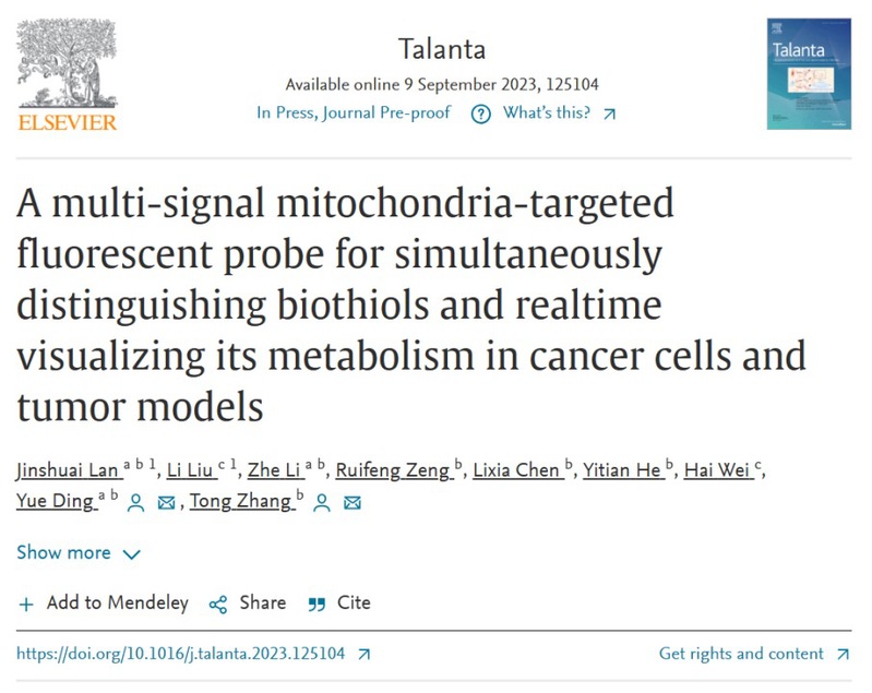 近日,h图书馆 张彤教授团队,在国际期刊Talanta上发表了题为A multi-signal mitochondria-targeted fluorescent probe for simultaneously distinguishing biothiols and realtime visualizing its metabolism in cancer cells and tumor models”的研究成果(DOI: 10.1016/j.talanta.2023.125104)。该研究成功合成了一种具有多通道、线粒体靶向的荧光探针,能够同时区分检测生物硫醇和二氧化硫衍生物,实现了细胞水平及生物体内硫醇代谢的实时、可视化监测,利用该探针中药活性成分藤黄酸在体内外抗乳腺癌过程中的硫醇代谢变化进行监测。这一研究成果为体内硫醇代谢的动态监测提供了有力工具,同时也为中药抗肿瘤活性成分的作用机制研究提供新思路。