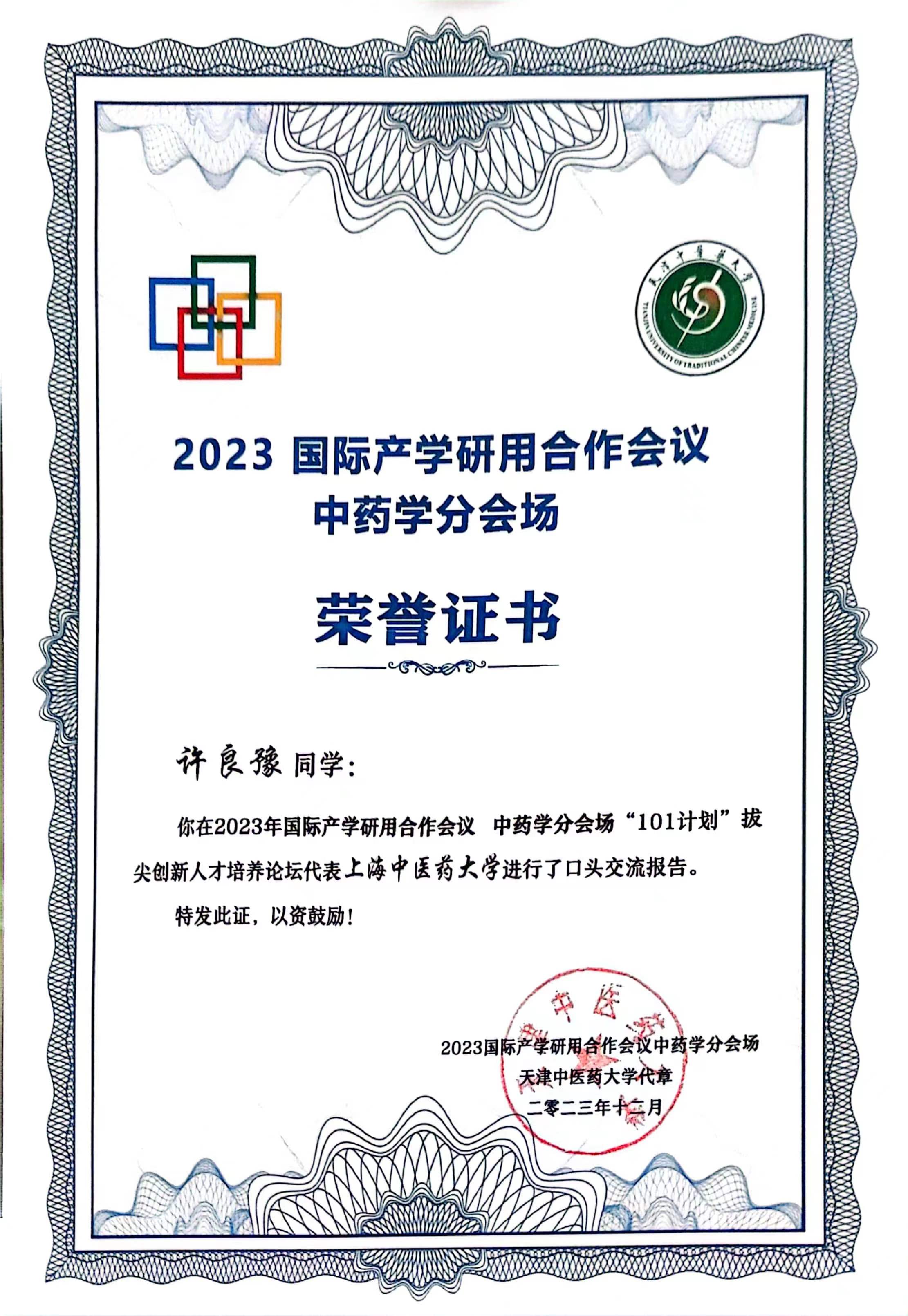 为响应教育部学校规划建设发展中心的相关工作要求,深入探讨拔尖人才培养中的关键问题,推动中医药事业的高质量发展,近日,2023国际产学研用合作会议中药学分会场在天津中医药大学举行,h图书馆 名誉院长徐宏喜,副院长郑昌武、教务副主任郑敏与3名2023级中药学创新班同学分别参与主会场和“101计划”拔尖创新人才培养分论坛交流。