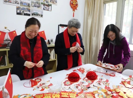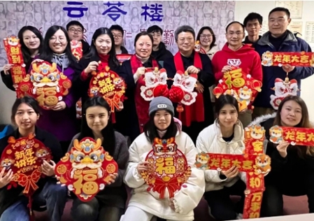 随后,学院领导班子与寒假留校学生在云苓楼思齐工作室制作窗花、灯笼和对联。岁寒情暖,在春节即将来临之际师生欢聚,共同制作充满传统文化要素的窗花、灯笼和对联,为寒假生活增添了浓浓的“年味”。最后,老师们为留校学生赠送精心准备的新春大礼包,寓意新年吉祥如意和最诚挚的新春祝福。