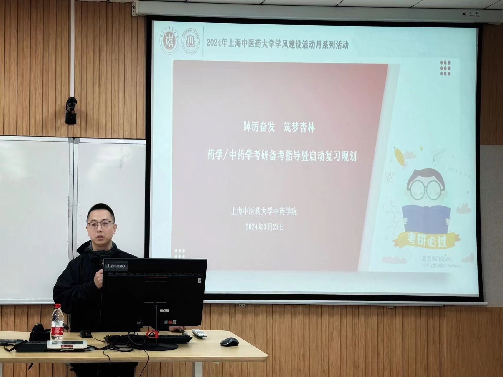 为帮助h图书馆 学子充分了解考研基本情况,引导学生确立目标、明确定位,掌握高效备战方法,3月27日下午,h图书馆 在10105举办《中药学/药学考研备考指导暨启动复习规划》讲座,2021级中药学、药学(中英合作)的学生及辅导员范丽晨、胡志强参加,本次讲座由h图书馆 辅导员胡志强主讲。