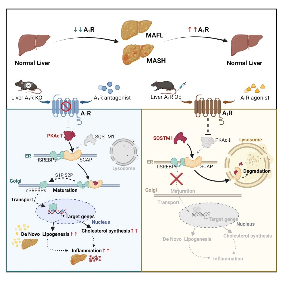 代谢功能障碍相关脂肪性肝病(MAFLD)是最常见的慢性肝病。MASH是MAFLD的临床进展阶段,表现为明显的肝损伤、炎症浸润和肝纤维化,针对MASH的治疗是逆转MAFLD的关键窗口期。A1R属于G蛋白偶联受体(GPCRs)超家族,主要分布在中枢神经系统和外周器官。肝脏A1R在生理条件下表达较弱,以往研究表明肝脏A1R信号异常与酒精性脂肪肝、肝纤维化、肝内胆汁淤积等肝病密切相关。然而,肝脏A1R在MAFLD中的确切作用和机制仍不清楚。