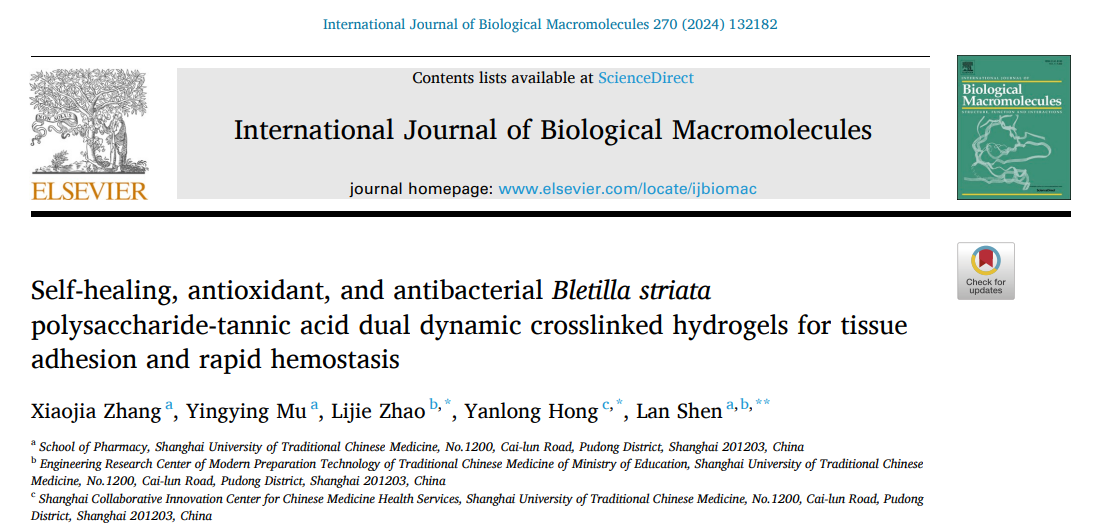 沈岚研究团队基于“药辅合一”理论,以双动态理化交联为设计策略,开发了一种用于伤口止血粘合的白及多糖基新型水凝胶,阐明了其中组分对材料成形和包括粘附性能在内的多项材料特性的影响规律及原理,为中药制剂传统“药辅合一”理论在现代制剂中的应用提供新场景。研究成果Self-healing, antioxidant, and antibacterial Bletilla striata polysaccharide-tannic acid dual dynamic crosslinked hydrogels for tissue adhesion and rapid hemostasis发表于国际大分子领域Top期刊International Journal of Biological Macromolecules。