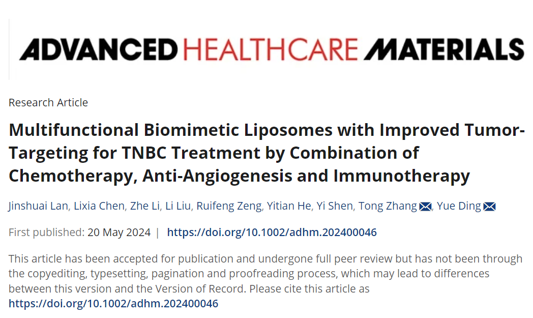 近日,我院张彤教授/丁越研究员团队基于中医“扶正祛邪”抗肿瘤理论与现代仿生纳米递药技术,研究开发了肿瘤细胞膜包覆的共载藤黄酸(GA)与人参皂苷Rg3(Rg3)仿生纳米系统(G/R-MLP),旨在通过肿瘤细胞介导的同源靶向和Rg3糖链上葡萄糖基介导的葡萄糖转运蛋白靶向的双重靶向优势,提高Rg3和GA协同抗三阴性乳腺癌作用,为乳腺癌治疗提供了有效策略。研究成果Multifunctional Biomimetic Liposomes with Improved Tumor-Targeting for TNBC Treatment by Combination of Chemotherapy, Anti-Angiogenesis and Immunotherapy在生物医学材料领域权威学术期刊Advanced Healthcare Materials上发表。