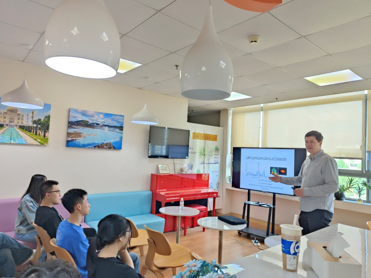 交流会后,郑昌武副院长邀请Daniel Sykes博士参观了徐宏喜教授课题组,与各位老师同学分享了他们团队在金属配位化合物合成及细胞成像方面最新的研究成果,并就同学们提出的问题进行了探讨和交流。Daniel Sykes博士还与课题组成员们分享了伦敦和上海的人文风情,讨论了两地的文化差异与共同点,增进了双方的相互了解。