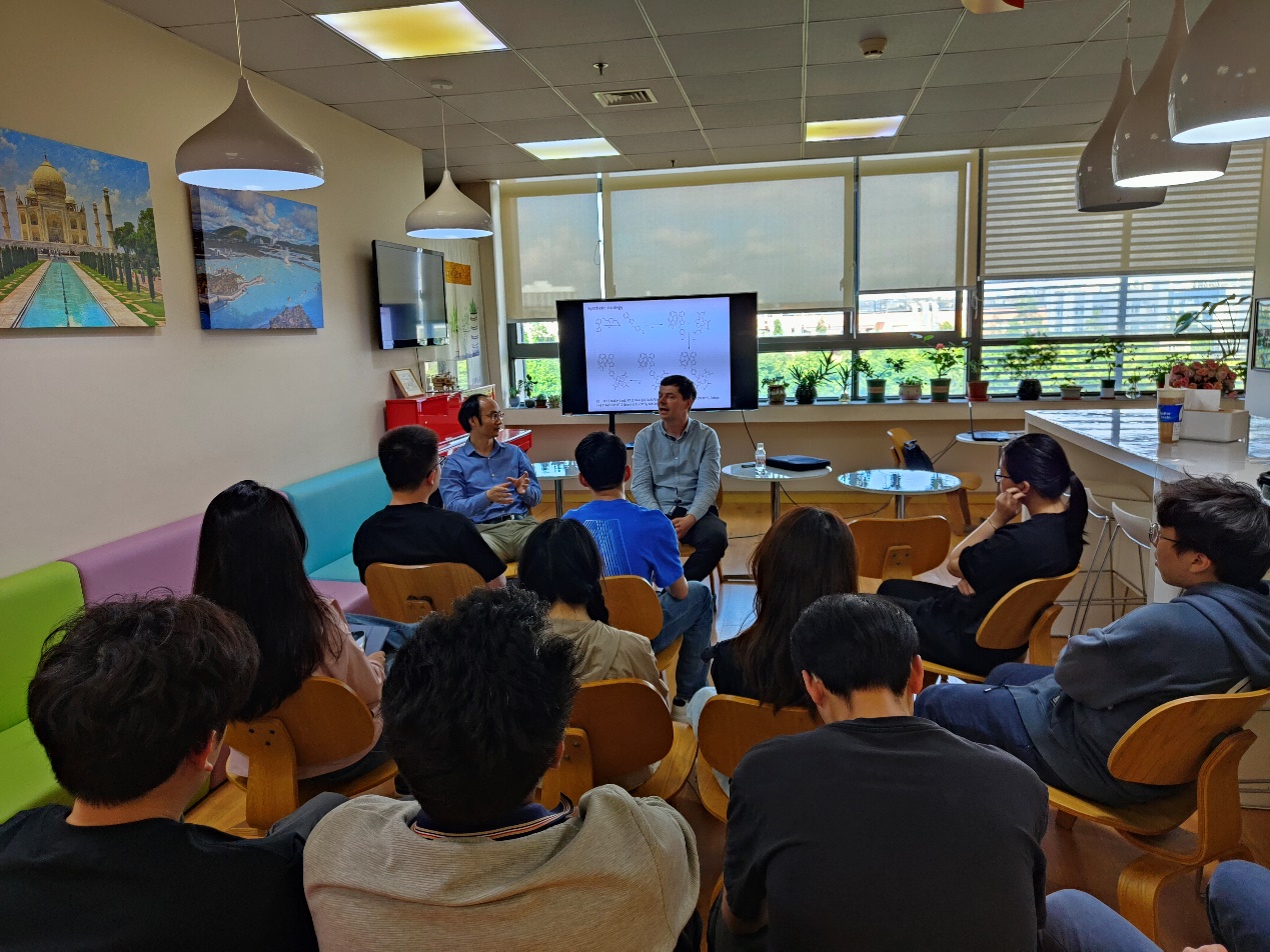 交流会后,郑昌武副院长邀请Daniel Sykes博士参观了徐宏喜教授课题组,与各位老师同学分享了他们团队在金属配位化合物合成及细胞成像方面最新的研究成果,并就同学们提出的问题进行了探讨和交流。Daniel Sykes博士还与课题组成员们分享了伦敦和上海的人文风情,讨论了两地的文化差异与共同点,增进了双方的相互了解。
