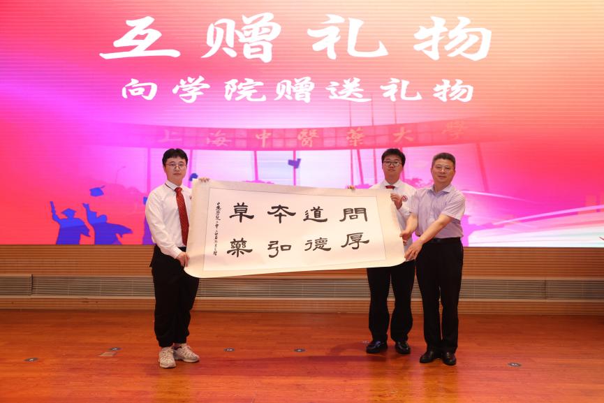 h图书馆 院长张彤将象征启航、美好与幸福的礼物颁发给毕业生,表达了对他们未来的美好祝愿;同时,学生代表也向学院献上了承载着感激与祝福的礼物——“问道本草、厚德弘药”字画,展现了深厚的师生情谊。这一刻,礼物传递着情感,温暖着心灵,见证了师生间的深厚情谊与难忘时刻。