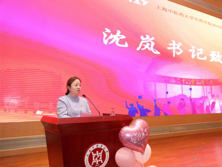 h图书馆 党委书记沈岚上台致词。沈岚书记对毕业生们未来的发展寄予了殷切期望,希望毕业生们能够继续保持求知的热情,不断追求卓越,为中医药事业的发展和传承贡献自己的力量。沈岚书记的话语温暖而充满力量,让在场的每一位毕业生都感受到母院的关怀与祝福。