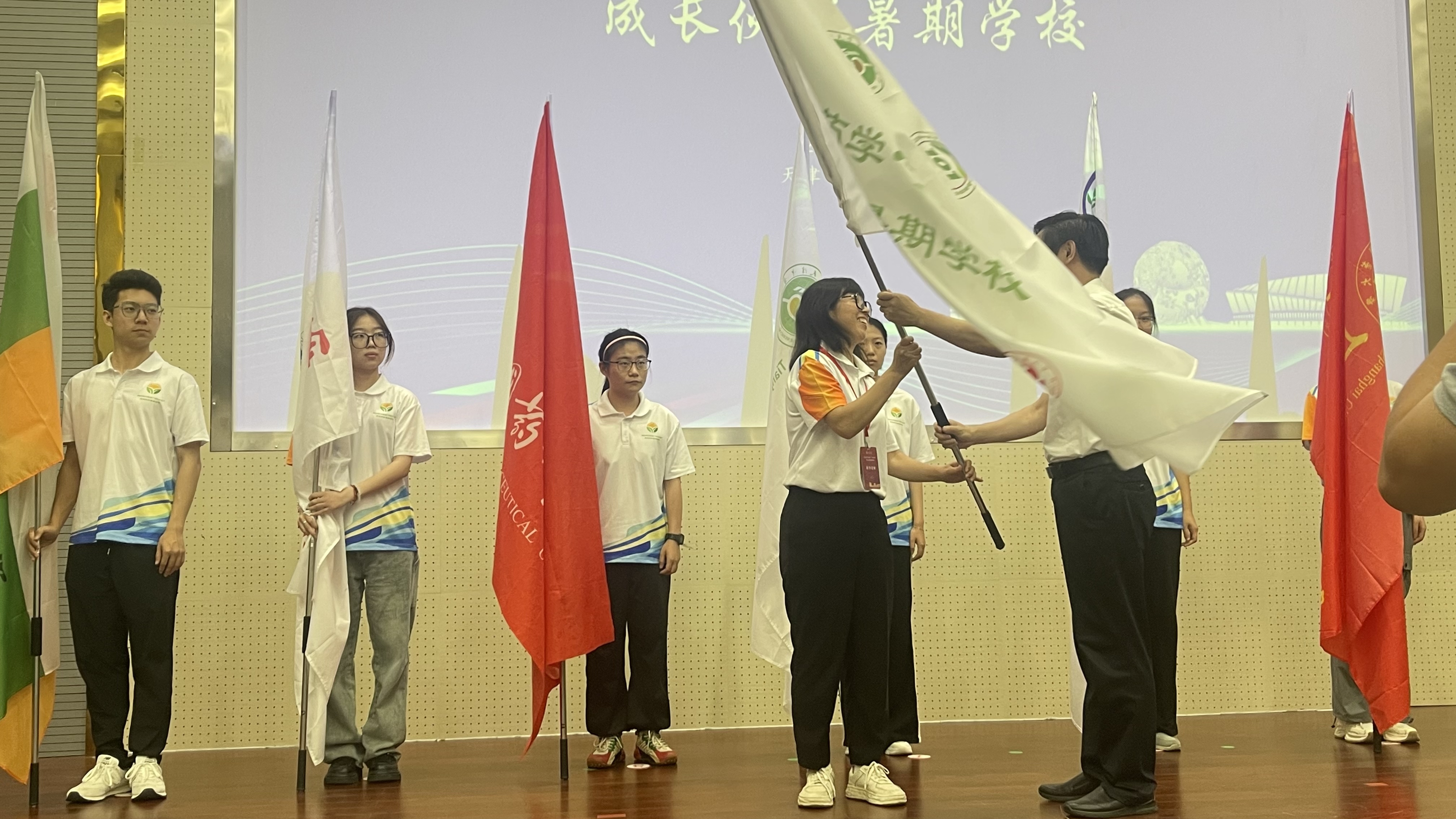 闭营仪式上,学校为参与暑期学校的学生代表们颁发了结业证书。h图书馆 作为明年暑期学校的组织方,由郑秀棉老师代表从天津中医药大学邱峰副校长手中接过了营旗。明年的暑期学校将由h图书馆 进行策划筹办,营旗的交接不仅象征着责任的交接,也代表了各校将继续加强交流,促进中药学拔尖人才的培养。
