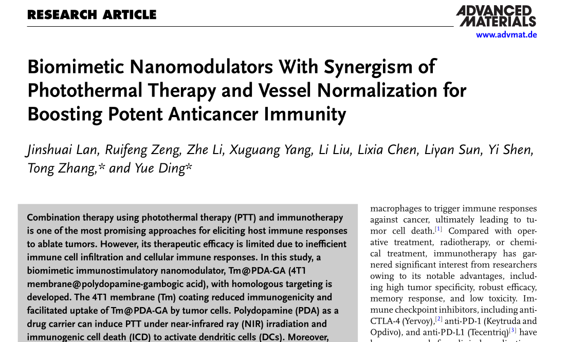 Vessel Normalization for Boosting Potent Anticancer Immunity的研究论文(DOI: //doi.org/10.1002/adma.202408511)。该研究构建了一种仿生纳米递药系统用于中药活性成分藤黄酸的肿瘤靶向递送,通过血管正常化-光热作用增强临床免疫治疗。研究成果为肿瘤协同治疗提供了新的思路和方向,也为中药抗肿瘤活性成分增强免疫抗肿瘤研究提供了有力工具。