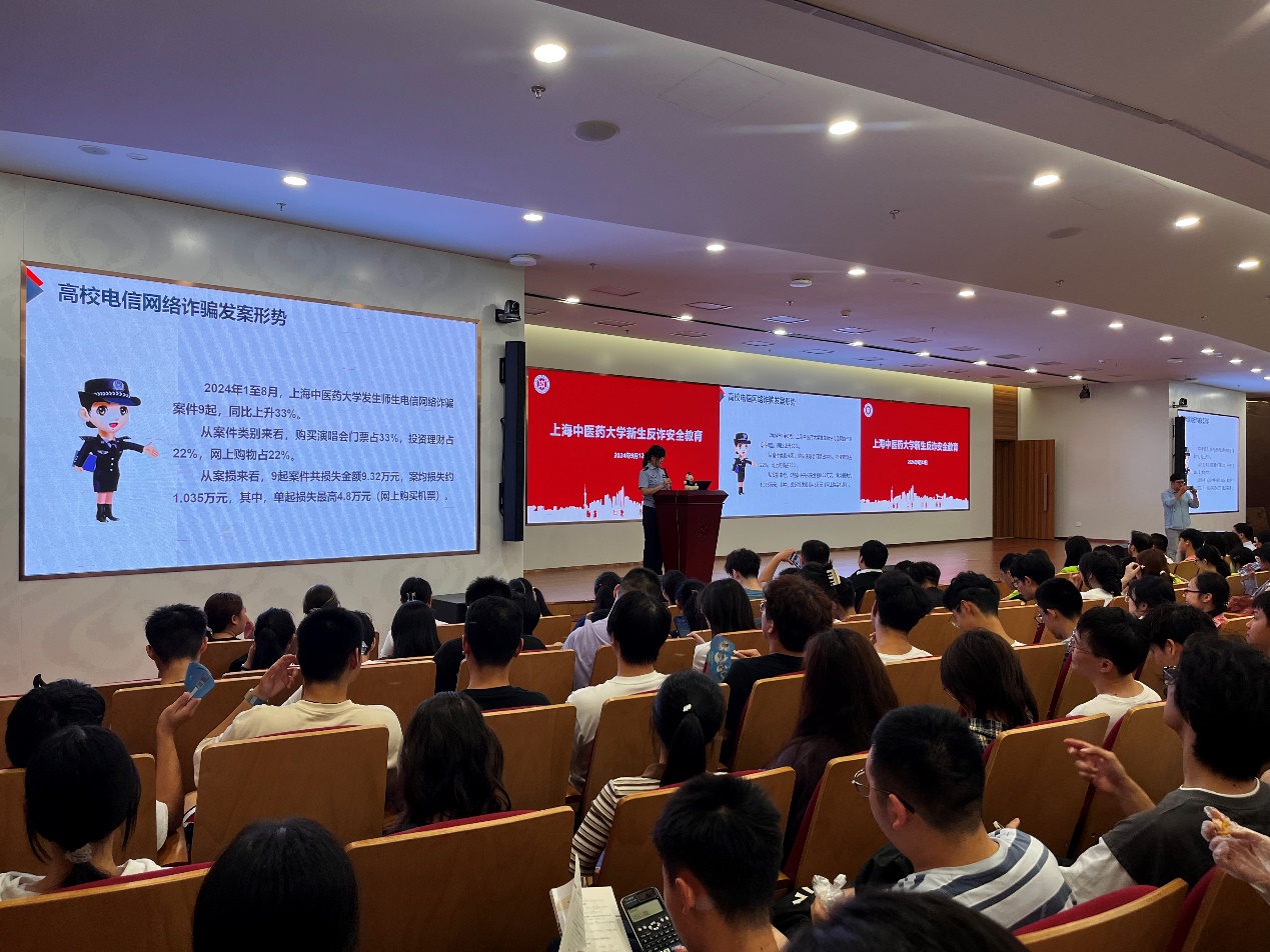 为增强新生安全防范意识,提高自我保护能力,构建安全和谐的校园环境,2024年9月12日下午,h图书馆 全体新生参加了安全教育第一课—— “防范于心,反诈于行”主题讲座。本次反诈安全教育专题讲座由h图书馆 、中西医结合学院和公共健康学院联合举办,特邀张江高校派出所殷慧警官为新生主讲。讲座由公共健康学院党委副书记干旦峰主持,h图书馆 党委副书记陆婧、中西医结合医院党委副书记国海东及各学院新生辅导员出席。