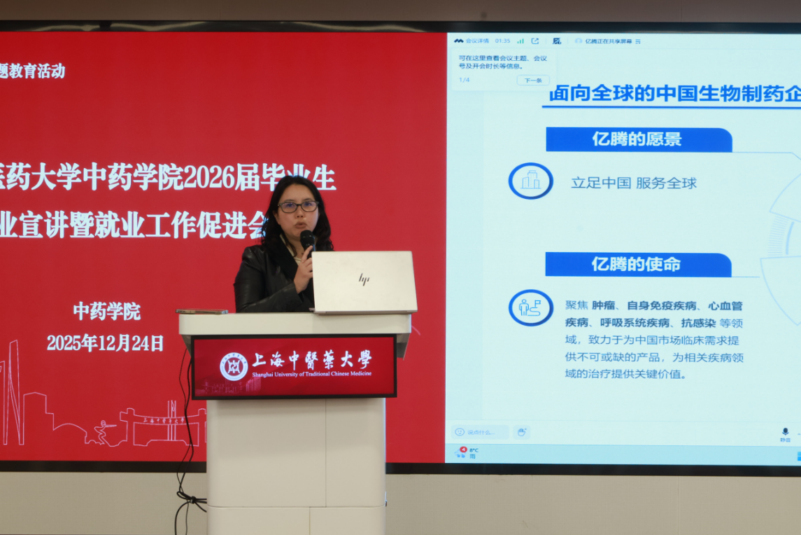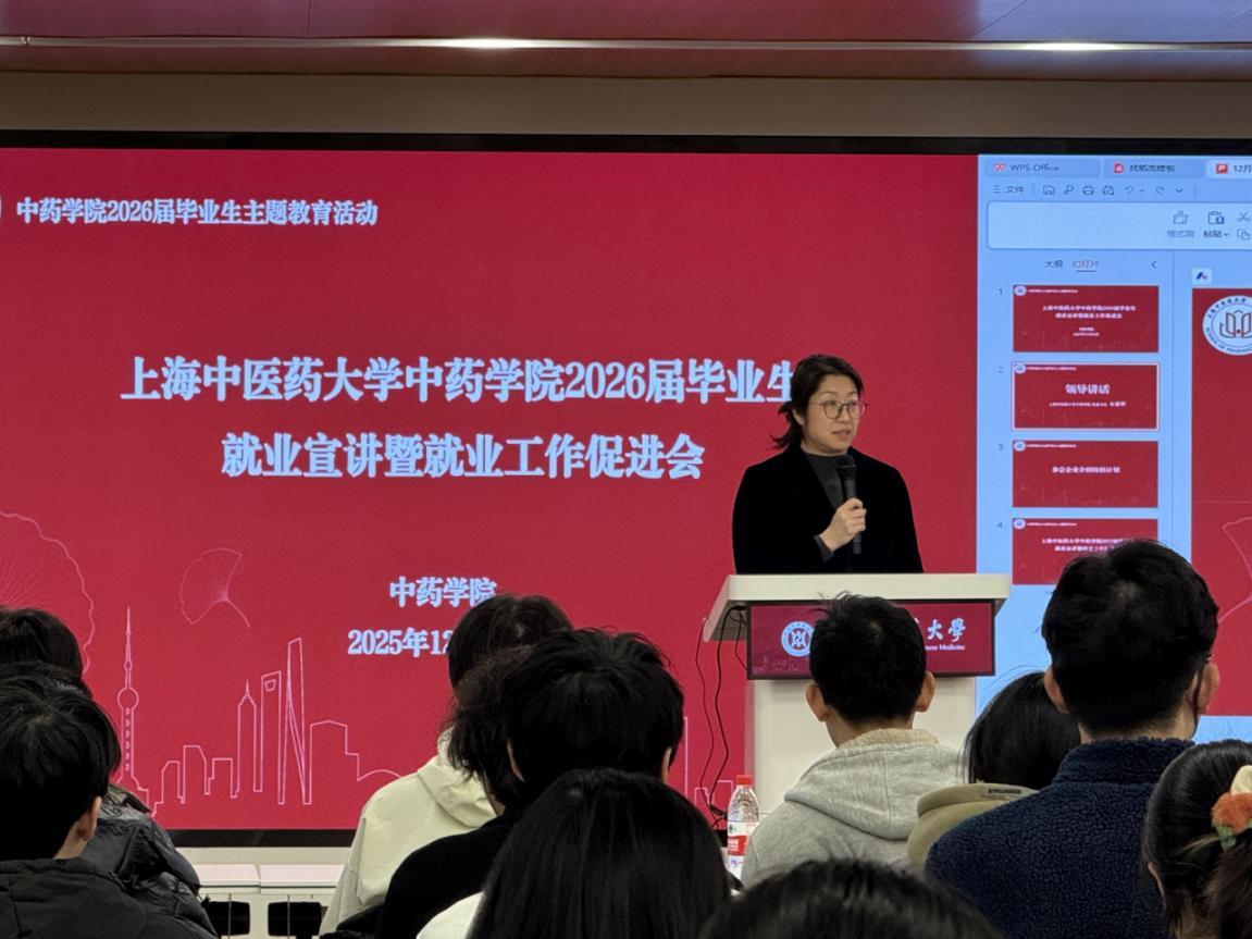 为深入学习贯彻习近平新时代中国特色社会主义思想,全面贯彻党的教育方针,扎实落实立德树人根本任务,切实推进2026届毕业生就业工作,搭建校企精准对接桥梁,助力中药学子实现高质量充分就业, 2025年12月24日下午,h图书馆 在标准化大楼辅楼301会议室成功举办2026届毕业生就业宣讲会。h图书馆 党委书记车荣华、党委副书记陆婧出席本次活动,活动由辅导员王盼主持。